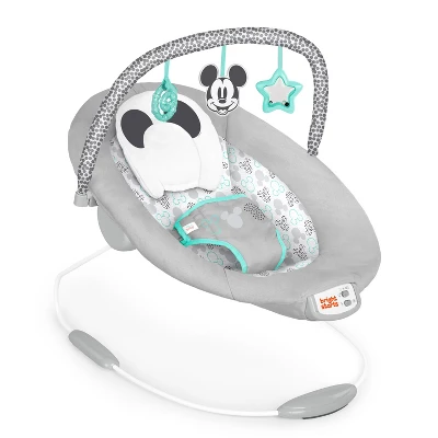 Welcome your baby to a world of Disney’s Mickey Mouse magic from day one! The MICKEY MOUSE Cloudscapes Bouncer from Bright Starts and Disney Baby will hug your baby in comfort with a built-in head support pillow. When baby outgrows the pillow, it’s easy to remove for a seat that fits just right. Super soft fabrics are perfect for your snuggle bug. This thoughtfully designed baby seat plays 7 magical melodies and soothes baby with optional vibrations. A removable toy bar dangles playtime favorite toys for baby to watch, reach and bat. Easily remove the toy bar with one hand when it’s time to scoop up your littlest Mouseketeer. And don’t worry about tucking this bouncy seat out of sight – the neutral Cloudscapes fashion is made to blend beautifully with your home décor!